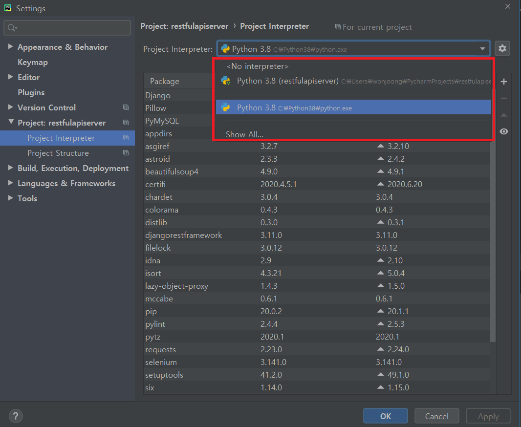 파이참 가상환경 오류 ModuleNotFoundError: No module named 'rest_framework'