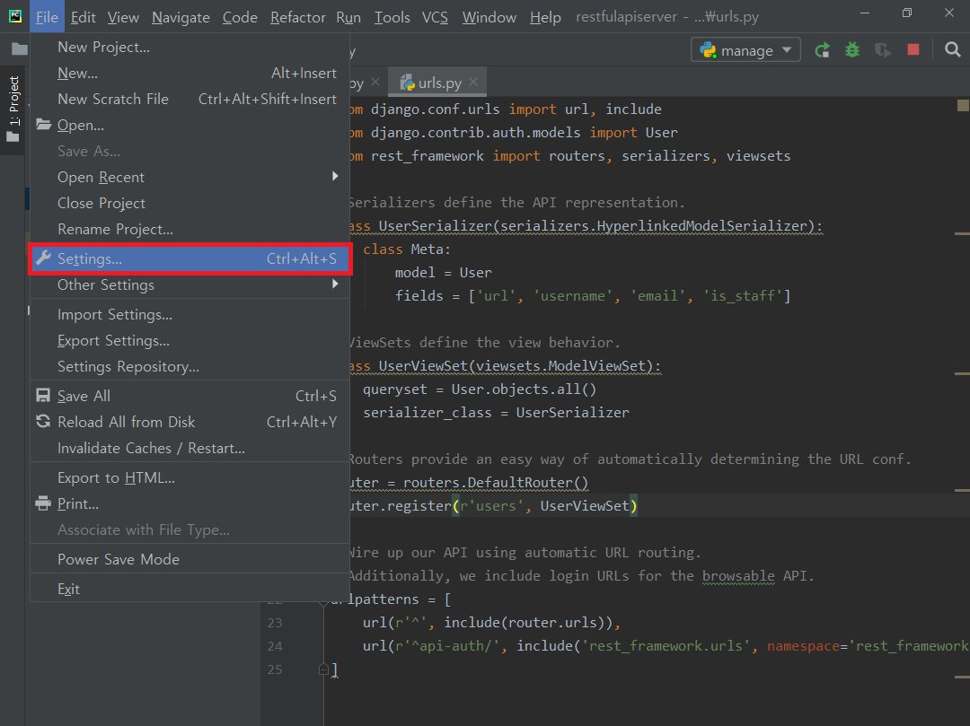 먼저 File->Settings...으로 이동해주세요.