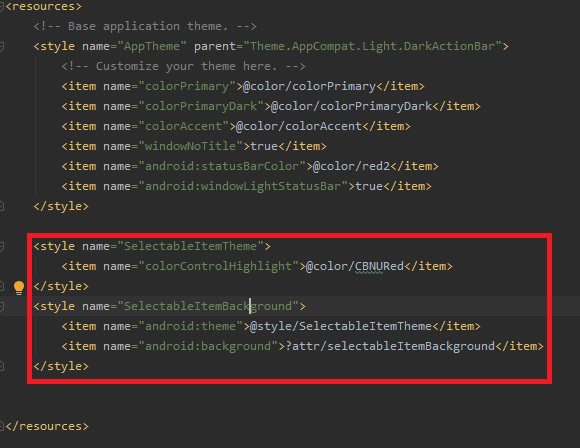 res>values>styles.xml에 들어가신 후, 빨간 네모 박스 표시 해준 부분을 입력해주세요. color는 여러분들의 기호에 맞게 설정해주시면 됩니다.