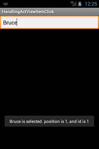 지금까지 보여드린 과정을 반영한 예를 보여 드리겠습니다. 프로젝트 이름은 HandlingActViewItemClick입니다. 먼저 실행 결과를 보시죠. (프로젝트 이름이 너무 길어 AutoCompleteText를 Act로 줄여 적었습니다.)