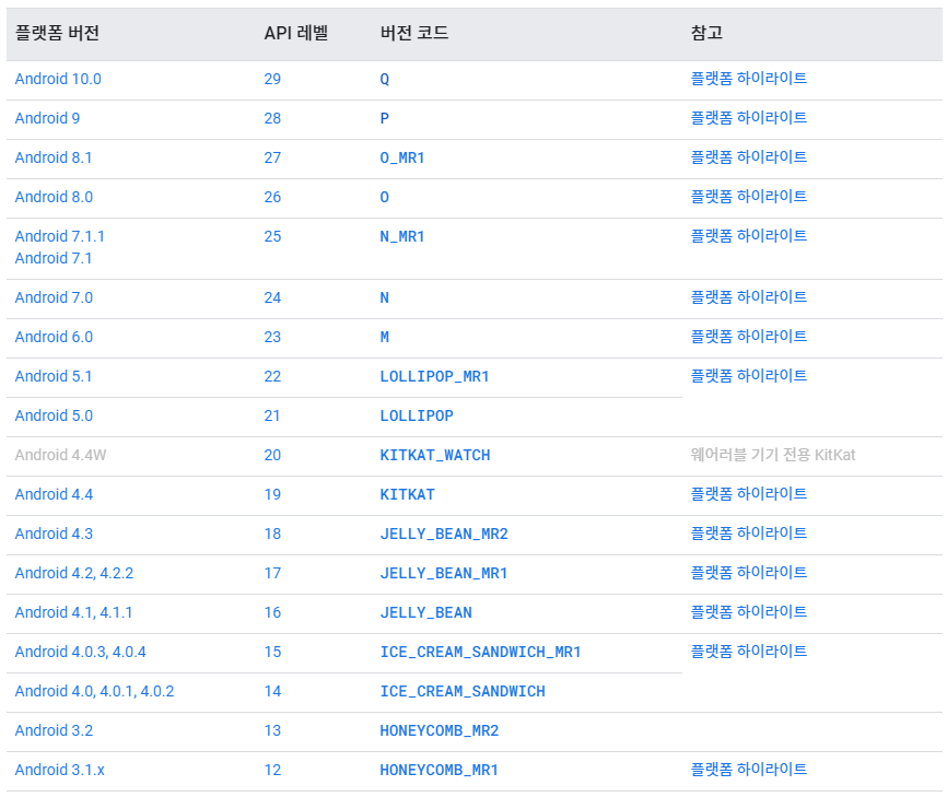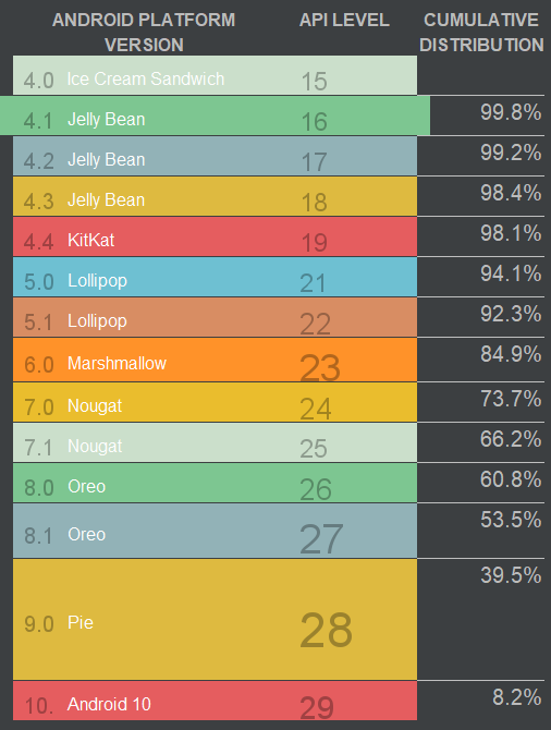 99%이상의 사용자가 젤리빈(API 16) 이상을 사용하기 때문에 그 이하의 플랫폼은 고려하시지 않아도 됩니다.