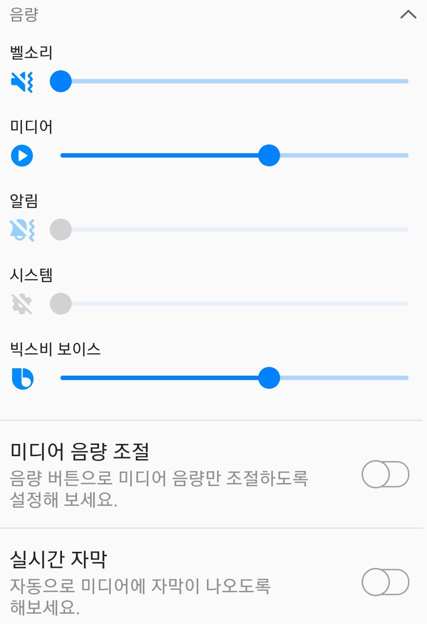 그런데 이와 같이 벨소리뿐만 아니라 미디어, 알림, 시스템, 빅스비 보이스가 있고, 통화 중이라면 또 다른 미디어 설정하는 화면이 나온다.