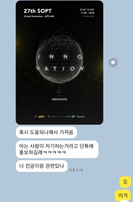 이 동아리를 처음 알게 된 것은 안드로이드 카톡방에 있다가 알게 되었는데, 그때 당시에 안드로이드에서 유명하신 박상권(Ted Park)님이 "대학생들이 이런 것들을 하고 있으니 한 번 확인해보세요~"라며 해커톤 링크를 주었던 것으로 기억난다. 그리고 이 동아리에 바로 지원해야겠다고 생각이 들었다.