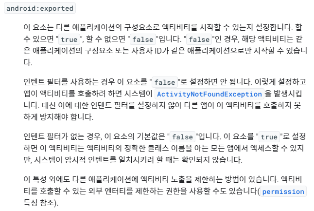 공식문서에 따르면 exported 속성은 아래와 같다.
