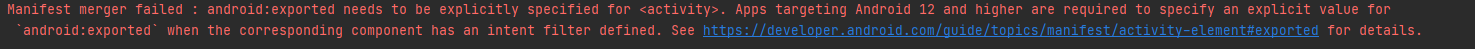 대략 해석하자면 Android 12 이상부터는 android:exported 값을 특정해서 Manifest에 넣어주어야 한다는 것이다.
