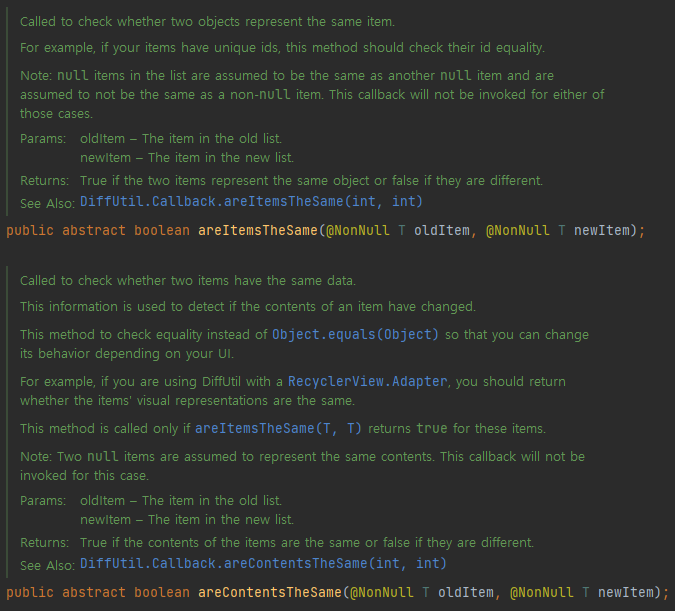 먼저 areItemsTheSame 함수는 Returns: Ture if the two items represent the same object or false if they are different. 라고 되어 있고, areContentsTheSame 함수는 Returns True if the contents of the items are the same or false if they are different.라고 되어 있다. 즉, areItemsTheSame 함수는 같은 객체인지 확인하는 것이고, areContentsTheSame 함수는 아이템들의 값이 같은지 확인하는 것이다.