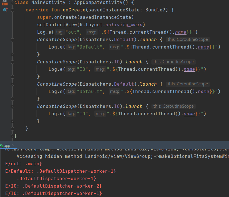 - IO Dispatcher는 Default Dispatcher와 Thread를 공유합니다. 따라서 withContext(Dispatcher.IO) { ... }를 사용하는 것이 실제로 다른 Thread로 전환하는 것은 아니며 같은 Thread에서 동작하게 됩니다. 아래 코드를 확인해봅시다.